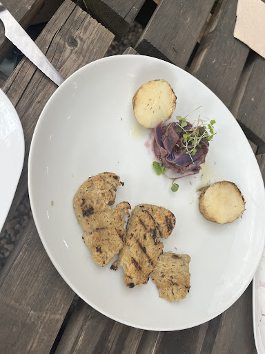 Plato de Seitán: nos dijeron que venía con verduras y patatas, adjunto foto para ver la decepción de las porciones. A parte de la escasa cantidad, el seitán es el peor que he probado con diferencia, estaba aguado, sin sabor y de verdad, se podía escurrir como una esponja. Estaba tan malo que ni pude comérmelo.