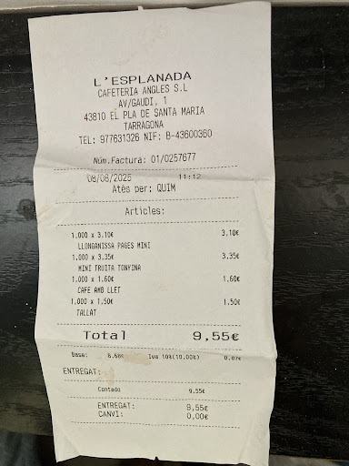 Read moreLa cafeteria L'Esplanada ofereix entrepans de qualitat com la truita amb atún o la truita de botifarra, en la seva versió mini que en realitat és de mida molt correcta al preu competitiu de 3.35 Euros. Les empleades són molt atentes i eficaces, creant un clima molt agradable. Molt ben situat a l'entrada del Pla de santa Maria, amb un bon espai d'aparcament. Un lloc idoni per a un bon esmorzar.