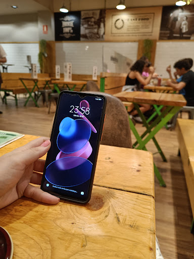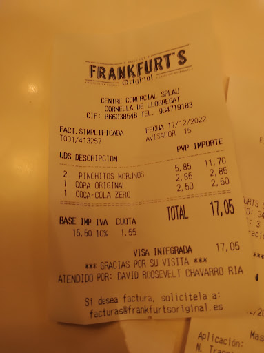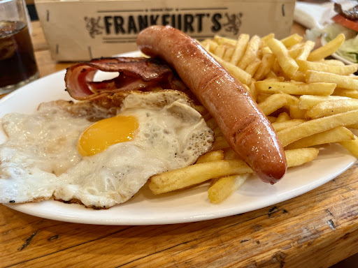Read moreHemos ido en varias ocasiones, la ultima recientemente después del cine y unas compras. Es un local amplio y con terraza. No tiene servicio de mesas, tienes que pedir en la barra. La bebida te la entregan al momento y para la comida te entregan un mecanismo que se enciende y vibra cuando tu pedido esta preparado. Primero pedimos su cerveza de tirador que es una tostada buena y la jarra de medio litro te cuesta 3,50€. Hay mas opciones, artesanas y de importación, pero de precios mas elevado. Un poco mas tarde pedimos un par de bocatas (4,50€ cada uno): pikantwurst y una butifarra de perol, que en el resto de Frankfurts que frecuento no suele haber. También unas patatas fritas que son congeladas y cuestan 3,95€ pero son grandes. En esta ocasión, he escrito una reseña, porque quiero destacar el personal. Se les veía por faena y eficientes. Y sobretodo quiero resaltar la atención del chico de caja, que según el tiquet se llama Kilian, pues fue muy simpático y amable. Hizo que la cena en un sitio que es sencillo y no destaca, haya sido un...