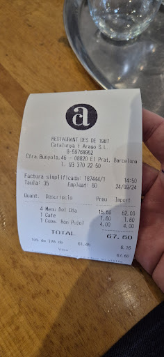 Menú 25€...esperamos que fuese mejor que la carta. Normalmente comer a carta debería ser mrjor que el menú, en este caso no. Primeros: anchoas del "catábrico"...ni eran de la escala, gambas al ajillo ( 8 mini gambas congelas con el aceite y los ajos quemados por 18€ ), el pan de cristal con tomate nos lo han traido a los 5min de acabar los primeros. Y los segundos: bacalao con sanfaina...bacalao seco con una pizca de cebolla y pimiento por encima. Costillas de cordero, 2 con hueso y 2 mitjanas ridículas...una lástima. Seguiréis teniendo el local lleno a base de engañar al comensal. La respuesta del encargado: " a veces acertamos y otras no ". Patético. Intentaré que no vuelva nadie de mi entorno. Catalunya i Aragó...