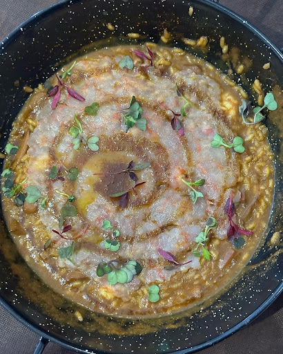Hemos empezado con unas croquetas de pollo rustido que estaban exquisitas, la farsa del rustido estaba de diez. Muy bien fritas y sabrosas. Y de ahí para abajo, todo regular. Hemos pedido un arroz del senyoret que estaba correcto. Sabor muy intenso a marisco, en exceso diría, y de cantidad correcto también. Sin destacar nada más. Hemos pedido pan, ya que va en carta, y he preguntado si se trataba de pan de pagès fresco a lo que la chica, muy amable, me ha indicado que sí pero que tostado. Bien, pues tostado sí que estaba pero no era pan de pagès. Era barra cortada al bies. Con un chorro de aceite, un hilo de aceite, que ni llegaba a todas las rebanadas. El pan extremadamente seco, no tostado. Aunque a la hora de cobrar nos lo han cobrado como pan con tomate y el precio 3'50€. En fin, sin comentarios. Los postres correctos. Espuma de crema catalana muy etérea caramelizada por arriba. La torrija en principio parecía un puding pero estaba correcta, aunque una torrija debería estar algo más jugosa. El crumble que acompañaba a la torrija duro en exceso.