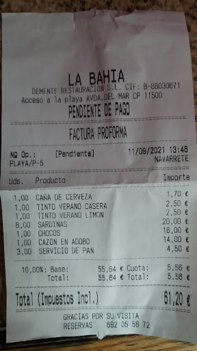 Read moreLas reseñas son bastante acertadas… este sitio para comer deja mucho que desear. Pedimos como entrante un aliño de hueva, y en su lugar llegaron huevos rotos… cuando ya teníamos dos de los platos principales en la mesa. La dorada estaba totalmente cruda —el propio camarero se sorprendió al verla—. También pedimos carne, solicitada al punto +, que llegó muy cruda y fría, por lo que hubo que devolverla para que la cocinaran más. La lubina, nuestro tercer plato principal, no apareció hasta 30-40 minutos después de los otros dos, y únicamente porque la reclamamos. Finalmente, dijimos que ya no la pusieran.