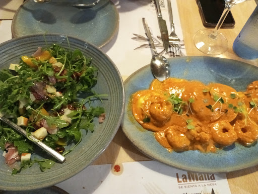 CONTRAS: -En lugar de preguntarte: donde quieren sentarse? te ordenan/dirigen en cuadrícula. A mí me ha tocado siempre en el salón interior. Creo q así no se aprovecha el gran potencial que tiene el recinto. -Lo nuestro fue una comanda completita: varios platos, cervezas, botella de vino, postre, ... Pues no entiendo que al pedir un chupito de limoncello, ver qué no lo ha entendido el camarero, porque me responde con un: vale, una tarta y un limoncello. Entonces con un gesto de dedos indicando un vaso pequeño, vuelvo a repetirle: pero de limoncello un chupito. Me dice: ok, y me trae una copa. Que por cierto no me tomé. Me parece un engordamiento extra o descarado, x ser más claro, de la cuenta. Sin contar con lo ya asimilado hoy en día: pan por defecto o copas de cervezas llenas hasta arriba. Por supuesto, mi intención era pagar el chupito. Se lo comenté al camarero, y me dijo que había entendido un copa y ahí me la dejó. También le comenté que nos estaba poniendo perdidos del producto con el que limpiaba la mesa de al lado jajaja, y dijo: que? Como si le hablara en chino y ya no lo volvimos a ver más. Me parece feo que quien te haya atendido toda la noche desaparezca para el momento del pago y despedida. -Por comentarlo todo, en cuanto a la comida se refiere: tarta de queso es lo único que no me gustó.