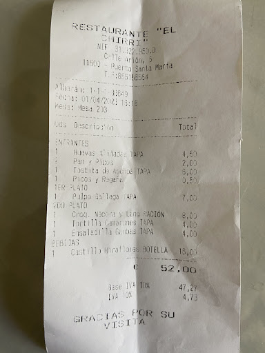 Read moreLa comida es de calidad pero de precio alto y las tapas escasas . Cobran pan y picos, que es lo habitual, pero pedimos más picos y nos los cobraron aparte…lo comentamos al camarero y no fue muy simpático. Solo argumentó que lo pone en la carta. Es la primera vez que me pasa eso. No repito EDITO PARA CONTESTAR AL PROPIETARIO. Gracias por tomarse la molestia en contestar. Pero creo que la respuesta no es del todo correcta o clara: Dice que cobran la pieza de pan (como yo decía, eso es habitual) y que regalan los picos hasta dos bolsas. Por un lado, no es cierto que regalen nada, pues cobran 1€ por persona en concepto de pan Y picos. Así figura en el ticket. Por otro lado dice que regalan hasta DOS bolsas de picos y que cobran a partir de la tercera. A mí me pusieron UNA bolsa de picos. Sí, en la cesta había 2, como también había 2 panes, pues éramos 2 comensales y habíamos pagado por 2 en concepto de PAN Y PICOS. Las dos bolsas de picos, que según dice en su respuesta "regalan"....¿son por persona o por mesa, independientemente del número de comensales? En cuanto al camarero, me voy a reservar la opinión pues no tengo pruebas, pero la actitud no fue lo más afable o educada. Como ya dije en el comentario inicial, es la primera vez que me cobran la reposición de pan o picos. Está claro que cada uno lleva su negocio como quiere, pero también está claro que los clientes tenemos derecho a manifestar nuestras opiniones. Y no es por el importe, pues está claro que 0,50€ no es para arruinarse, ni propietario ni cliente, pero no es lo normal. Y muchas gracias por invitarme a volver, pero no,...