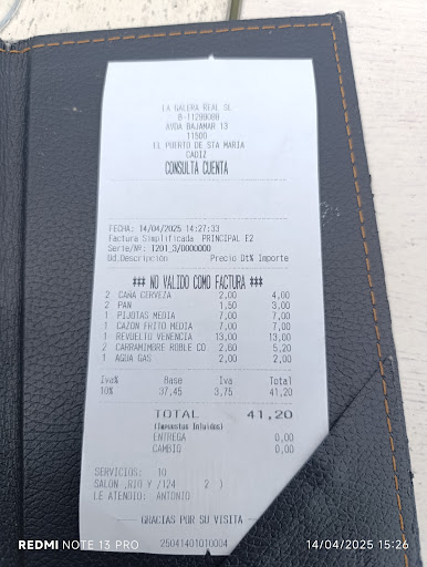 Read morePara esa fecha muy pocos restaurantes estaban abiertos, decidimos quedarnos aquí después de hacer una cerveza, (el camarero de la barra nada simpático)y nada de tapita, el lugar es muy cuqui, es del Club Náutico de El Puerto de Santa María, cómo para socios, había solo una mesa ocupada y nosotros, el camarero agradable y atento, pero su boca daba mal aspecto, no pegaba con el entorno. Pedimos el revuelto Venencia 13€ y cuando nos trae el plato miramos y no estaban las gambas, llamamos al camarero y nos dice que era culpa de él y que se le había olvidado decirnoslo que no les quedaba, después de habernos puesto el plato y nosotros no teníamos claro si lo habíamos tocado con el tenedor, no nos dio la posibilidad de cambiar por otra cosa, tampoco nos compensó con nada extra. El pescado y el vino...