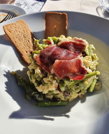 Detallo lo que pedimos y probamos: croquetas de gurumelos (normalitas, cremosas pero poco sabrosas), revuelto de espárragos trigueros (el espárrago no estaba bien cocinado y estaba aprovechado mas tallo de lo debido teniendo presencia una dureza curiosa el plato), carrilleras (muy tierna, limpia y sabrosa, sin duda el plato top de nuestra selección. Muy recomendable), espinacas con garbanzos (ricas pero excesivamente aceitosas y los garbanzos prácticamente eran inexistentes), presa ibérica (estaba tierna y sabrosa), ensaladilla de gambas (una ensaladilla mas).