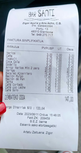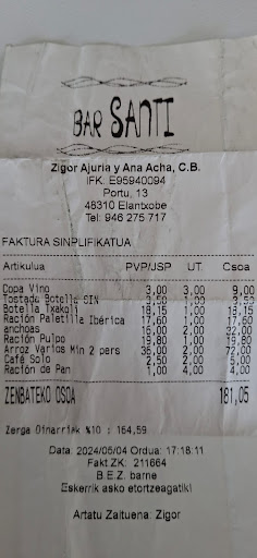 Read moreOtro día no se, pero hoy, 28/12, nos han atendido fatal. No han querido darnos de comer (ni siquiera raciones) cuando aún tenían la cocina abierta y una mesa (con reserva) por llegar, así que hemos comido lo que había en la barra. La persona atendiendo la barra (Santi?) mal encarado y antipático. Parecía que nos estuviera haciendo un favor. Después de pedir 3 bebidas, 6 pintxos y 4 gildas, nos ha plantado la nota aprisa y corriendo. Yo pensaba que estaba cerrando (y de ahí las pocas ganas y el mal humor) pero no, al de un momento estaba la barra otra vez llena de pintxos nuevos y ha llegado la mesa con reserva a la que si han dado de comer. Una pena. Un pueblo tan preciso y un bar tan bien ubicado… lástima que te dejen con tan mal sabor de boca. El café, por supuesto nos lo hemos tomado en otro sitio (Gernika) donde nos han...