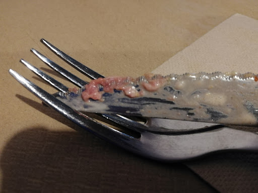 Hablando de presentación: las hamburguesas vienen en unas bandejitas con un papel tipo envoltorio que no resulta nada práctico si quieres usar cuchillo y tenedor. Cortar la hamburguesa termina siendo un caos, con el papel rompiéndose y mezclándose con la comida. Puede que visualmente quede bien en fotos, pero en la práctica es incómodo, especialmente si alguien no puede comerse la hamburguesa entera de un bocado.