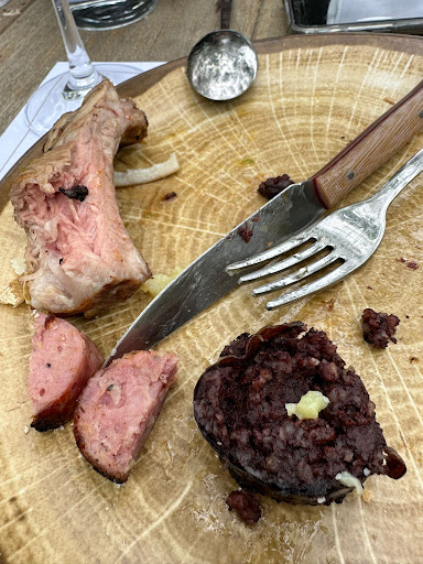 Pertenece a la bodega Marqués de Riscsal. Parece ser q solo está operativo cuando el.tiempo lo permite ya que es al aire libre. 50 euros por persona el menú con botella de vino de la bodega (Arienzo) Por ese precio deberían darte comida en abundancia pero no es así. No puedes repetir ni hay un aperitivo ni entrante. Pochas con chorizo ( una cazuelita) o patatas a la riojana ( ya no quedaban) Chuletillas de cordero con ensalada o patatas.( 5 chuletillas contadas, que cuando quitas el.hueso se quedan en nada) Postre a elegir entre varios. Lo nuestro era torrija y tarta de queso, muy ricos. Para mí, comida rica, tampoco exquisita, pochas bien guisadas y las chuletillas normalitas. Si ese menú fuera de 30 euros no digo.nada pero por 50 me parece muy caro , por cantidad y calidad. El servicio podía haber estado mejor pero había dos mesas grandes de un autobús y se centraban más en ellos. No le doy más importancia porque iba sin prisa y hacía un día precioso, se estaba bien allí. En algunos momentos las moscas molestaban bastante porque se te posaban en todo, así que con una mano comes y con la otra las espanta🤷🏻♀️ Es lo.q tiene estar...