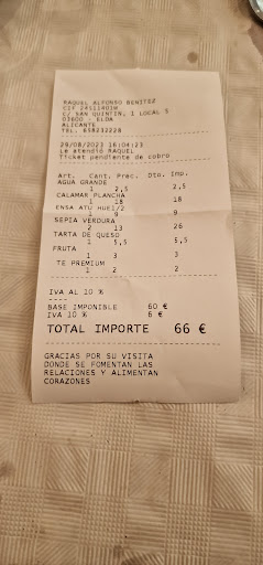 En la cuenta nos quisieron cobrar una botella de agua que ni si quiera llegamos a abrir porque el arroz nunca apareció y el pan con tomate también lo quisieron cobrar sin haberlo sacado a la mesa.