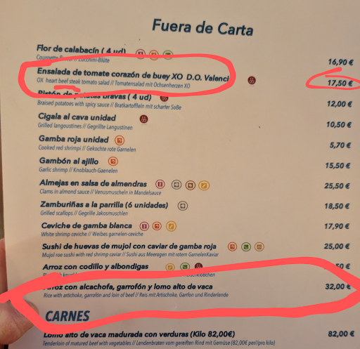 We ordered only from the recommendations. My partner ordered the tomato salad, which, according to the English translation, was supposed to come with beef steak. We were told it was probably a poor translation. Well, the salad was just a large tomato cut into big chunks. See photo. Even parts of the stem were still visible. That, with a bit of arugula or something similar, for exactly €17.50 — see photo. My ceviche wasn't really tasty. It was a carpaccio of shrimp with a sweet-and-sour coconut cream.