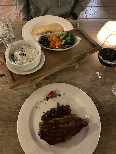 Having booked in advance and liked the photos and reviews on Google, I was looking forward to a nice restaurant with white tablecloths and a high end experience as shown on their website and Google photos and Tripadvisor. This is not what I experienced! It's a roadside restaurant with an indoor space but most diners are seated in a tarpaulin covered "terrace" with plastic tables and dusty floor. We're we're seated by the door next to a gas heater that seemed to attract flies and bugs. Whilst the maitre d' was welcoming and friendly, he seemed preoccupied with a large group he seemed to know well. The rest of the staff are young and pleasant enough but inexperienced. One tall waitress thought it ok to fix her hair in full view of diners taking time to pull her into a bun, and then clip her hair in place whilst stray hairs floated all over customers. We ordered wine that finally arrived after we'd finished our starters. The food was good though. Lovely steaks and nice menu presentation. After we'd finished eating, they just ignored us, we had to go inside to get the bill as no one was managing the staff. Overall would not return, it's a nice menu and the food is good, it's just the poor front of house team, and the disappointing terrace that let's it down. Don't let the photos fool you, it's definitely...