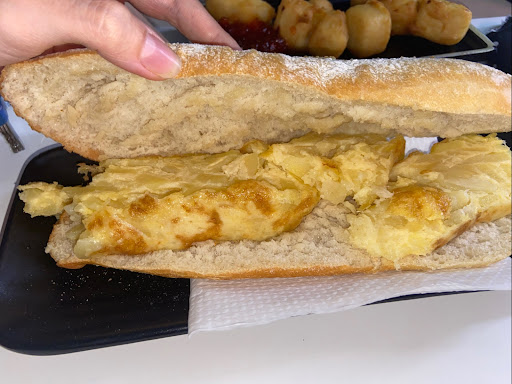 Fuimos a cenar dos personas, y pedimos, en primer lugar, un bocata de tortilla de patatas, muy grande por 2,5€, ambas personas alucinamos cuando vimos el tamaño del bocadillo, ademas la tortilla estaba muy sabrosa y el pan era de estilo chápate muy rico, además pedimos también una tostada, en el mismo pan, de atún y tomate natural y no os podéis imaginar lo cargada que iba de atún, ademas el atún estaba delicioso, de muy buena calidad y se notaba que venía en aceite de oliva. Además de esto, pedimos dos entrantes, en primer lugar queso frito, un clásico que esta increíble, además en este bar lo hacen rebozado y le da un toque delicioso, me encanta, venía acompañado de mermelada de tomate, también delicioso. También pedimos patatas hervidas con ajo y perejil que estaban muy buenas, le textura de la patata estaba en su punto y el ajo también, no estaba súper picante y eso es de agradecer.