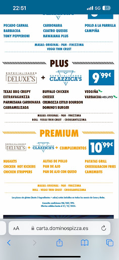 El pasado viernes fuimos un grupo de amigos a cenar. Nos sentamos en la mesa dispuestos a pedir la promoción come y bebe (bufet libre). Tras escanear el código QR de las mesas decidimos pedir el menú de 10,99€ ya que era todo incluido. Nuestra sorpresa llegó cuando pedimos y la camarera nos estaba cobrando 12,49€. Le preguntamos que por qué no eran los 10,99€ que ponía en la carta y nos dijo que no, que eso estaba mal, que los precios son los que pone en la carta impresa en papel. Tras esto, nos trajo la carta en papel en la cual ponía que esa opción costaba 12,49€. En ese momento nos dimos cuenta que no tenía razón porque esa carta estaba caducada desde hacía meses, en la letra pequeña de abajo llevaba meses caducada. Como la camarera no nos daba ninguna explicación lógica de lo que estaba pasando, le dijimos que no estábamos de acuerdo, que por favor llamase a su superior. En ese momento cambió su actitud y de forma ofensiva nos dijo que los encargados estaban muy ocupados y que los precios eran los que ella decía, sin explicación ninguna. Tras unos minutos la encargada de la sala se acercó a nuestra mesa a decirnos que el código QR que habíamos escaneado estaba erróneo y que nos tenía que cobrar lo que ponía en la carta de papel (recordemos que tampoco era correcto porque la fecha de esos precios estaba caducada). No nos ofrecieron ninguna disculpa ni tampoco una oferta, ni absolutamente nada. No asumieron su error y su culpa. No solo eso si no que desprestigiaron a Domino’s de Murcia y Alicante ya que nos dijeron que ellos tenían los precios más caros aún. La experiencia fue nefasta ya que no nos dieron ninguna explicación y ninguna solución. Era lo que ellas decían, y punto. Nada más. Ante una situación como esta no deberían haber tratado así a los clientes. Deberían haber asumido su error, cosa que no hicieron. Dejo la foto que demuestra que el código QR decía que la promoción premium costaba 10,99 y no 12,49 que es lo que finalmente...