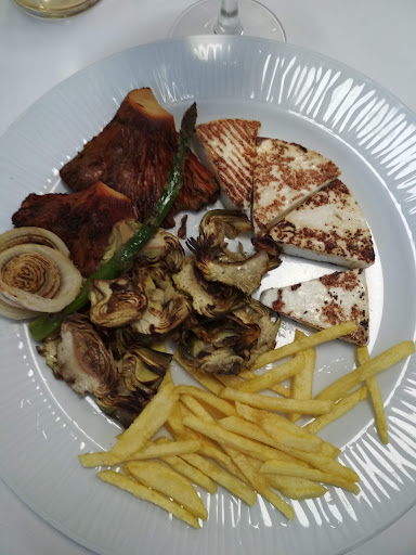 Hemos pedido varios entrantes, acompañados con pan. -Destacar por encima de todos, el buñuelo de bacalao, acompañado de una salsa, espectacular. -Los calamares acompañados de alcachofas, a parte de ser un plato bastante caro, las ración se ha quedado muy corta. Las patatas bravas, naturales, buen corte y un toque picante muy rico.