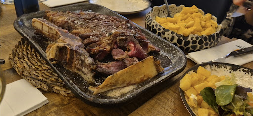 Alrededor de las 14:30, momento de nuestra llegada, el restaurante estaba ocupado en un 75%. Optamos por unos huevos rotos, que sorprendentemente llegaron con queso parmesano rallado, un detalle no mencionado y que deberían haber advertido por posibles intolerancias. También pedimos unos tacos Pibil, que estaban un tanto secos pero con un buen sabor. Como plato principal, elegimos un chuletón de 1.050 kg para compartir, y de postre nos deleitamos con una tarta de queso y una torrija de Pantone con chocolate fundido por encima.