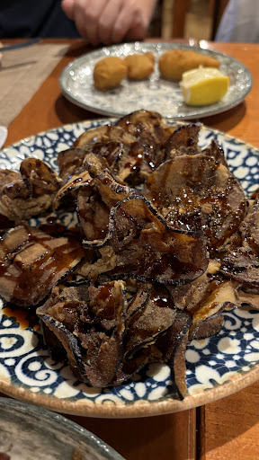 Fuimos un grupo de amigos y probamos varias cosas, la comida en general era bastante normalita . La berenjena con miel estaba muy quemada, sabía a papel demasiado frito. Pedimos unos chupa-chups, están curiosos y son muy novedosos, pero el queso era demasiado fuerte a mi parecer . El queso frito con tomate estaba bastante bueno aún que también se pasaron quemando el queso por fuera y estaba demasiado tostado pero nos gustó. La alcachofa con foie no nos gustó por qué el sabor era demasiado fuerte, únicamente sabía a foie, debería haber sido un poco más suave el sabor . Probamos también unos trocitos que había como de tiburón , y estaban muy buenos . También pedimos unas tortas como de pescado, y también estaban muy fritas, se quedan demasiado duras . Pero lo mejor fue el vino dulce que elegimos, sin duda, no es muy común , pero nos gustó mucho, la chelo se llamaba el vino. En general fue bien, pero mejorable...