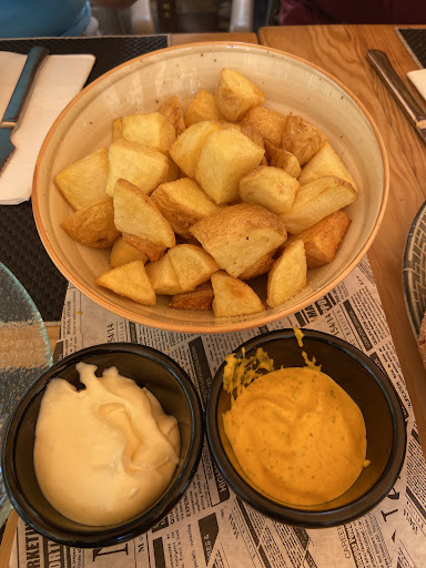 Terrible experience, probably the worst place we have been to, there were 6 people apart from us in the restaurant so hardly busy when we finally got served we ordered a starter and main each, whilst we were waiting the staff were restocking the bar right next to where they put us (also outside toilet) the made an incredible noise with the bottles and crates without a care, when the meal came there was no starter when we said we hadn't had the first plate the waiter said he would go and get it, at that point we said no as we didn't want our starters with the main, once he left we went to start on the main we both had the same burger and chips, this was completely unedible the chips were hardly warm, the caramelised onions had obviously just come out of a jar in the fridge and were cold and the bun was cold to touch, we didn't eat just paid our drinks bill and left, the drinks were also expensive for the area, go next door if you want a good meal we have eaten...