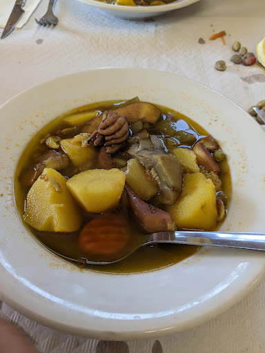 -- lamb chops - perfectly cooked and delicious. They restaurant used to butcher onsite but because of the changes in law, they go directly to a trust farm and still do the work! The upmost respect to the animal through their preparation, cooking (perfectly medium rare - if you cannot eat it this way, don't order), and seasoning (salt). Outstanding !!! -- fried papas with sweet pepper - perfectly fried in a delicious oil that you can only find in Spain. -- chorizos, morcilla, and sausages plate - again amazing. Morcilla was perfectly cooked and was exquisite. Chorizos had perfect spices. I would have to assume that they make the all of these onsite. A must. -- berberechos (cockles) in liquid with lemon as a starter - amazing! -- cocido - here it is cooked with chicken and garbanzos for 3.5 hours and served with a meatball made from ground mean, bread, and eggs. Fantastic dish, silky smooth broth, soft delicious chicken, and the meatball was light and fluffy. The dish was out of this world.
