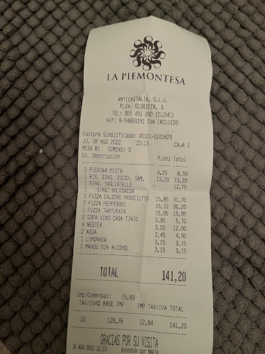 Read moreWelcome to Restaurante Lungo Rip-off. This is not a pizzeria, this is an investment run by Grupo Piemontesa. We the herds of clients are stupid we pay €16 for a cracky pizza with many black burned parts, €3,15 for an ice tea and €14 for a risotto with 1 gamba and 1 slice of zucchini. Shareholders of Grupo Piemontesa will probably make jokes about us, if they discuss results of their investment and count the money.