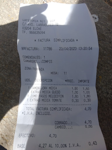 Read morePedimos... tardan muchísimo en traernos las cosas... nos las traen a destiempo ...nos faltan cosas que hemos pedido... y las que nos traen están mal, cómo puedes tardar tanto en traer una simple tostada y cuando la traes mal ..te la vuelves a llevar y sigo esperando....cuántas veces piensas manipular mi tostada?y por cierto con simpatía cero ya que has traído mal las cosas por lo menos se agradable y pide disculpas, me cobran por un zumo de melocotón y una tostada con tomate jamón york y queso 4,70 y fíjense que por una tostada te marcan tres cosas me voy a informar sobre este ticket a ver si esto se puede hacer así o estáis estafando a la gente, una que no va más y no va a recomendar el lugar Que pena de lugar que personal más poco cualificado.....al chico camarero le sobra prepotencia y le...
