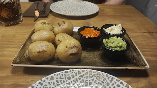 Llegamos con hambre canina, pedimos 2 medias raciones, que están genial para un par de croquetas y un par de quesos, unas patatas asadas con salsa y dos burguer, y fue mucho más que suficiente, de hecho nos costó acabar la comida.