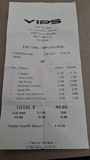 Read moreMi novia y yo decidimos visitar Vips para disfrutar de una comida casual juntos. Optamos por pedir un perrito caliente y una hamburguesa BBQ. Desde el momento en que entramos, fuimos recibidos con una cálida bienvenida por parte de Irene, una trabajadora excepcionalmente amable que nos atendió durante toda nuestra estancia.