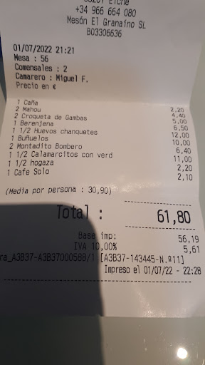 Sin duda alguna Mesón el Granaino es uno de esos sitios donde todos queremos volver, quizás el restaurante más conocido de todo ELCHE y no cabe duda de que es por algo. No es un restaurante barato donde comas por 12€ pero si comerás increíblemente por una media de 22€ en su barra, cabe decir que es muy difícil destacar un plato puesto que todos y cada uno están exquisitos, a cada persona le gusta más una cosa u otra más el marisco o más la carne os dejo unas sugerencias que nos encantan. Para empezar nos gusta pedir una caña y una marinera y así ir abriendo boca mientras pensamos que elegir en esa ocasión, nutría platos favoritos son: -Calamares salteados con alcachofas y trigueros. -Ensalada templada de calamares y gambetas. -Hígado de Pato a la parrilla con alcachofas. -Pulpo al horno. -Jamón Serrano. -Solomillo trinchado para compartir. Podría seguir hasta nombrar todos sus platos. Cabe mencionar la grandísima atención de sus camareros y que en la barra y la terraza no se puede reservar, únicamente se reserva en el salón pero ten la previsión de hacerlo unos días antes si no has tenido esa precaución te invito a que vayas igualmente y comas en la barra es una delicia.