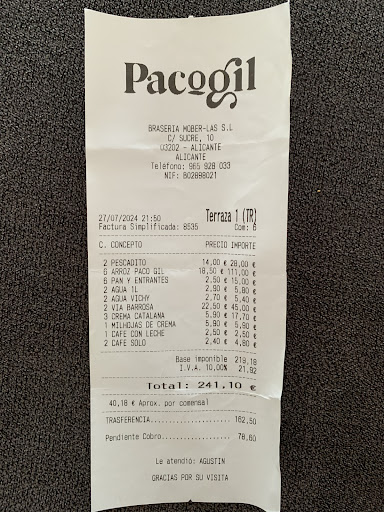 Read moreFuy con mi familia éramos 9 personas y nos cobraron 530€ pedimos: 2 platos de queso y nos lo sirvieron que solo había un trocito de queso para cada uno, dos platos de calamares, 2 platos de tomate con capellan y una paella para los 9, nos la sirvieron en dos paelleros a duras penas pudimos ponernos cada uno un plato en condiciones nos quedamos con hambre y eso que pedimos entrantes, el servicio de platos y cubiertos algunos estaban sucios, parecía que habían recien comido con esa cubertería, la calidad de la comida estaba bien pero las raciones super escasas te quedas con habré, tuvimos que pedir unos platos de carne y aún así no nos quedamos saciados, para variar los precios por las nubes y eso que no pedimos postre, consumimos 2 botellas de agua medianas, 4 cocacolas ,3 jaras de cerveza y la mitad era todo espuma y 2 botellas de vino de la casa, demasiado caro para lo que era y en último lugar el servicio nos atendieron 2 personas una camarera y un camarero, la chica muy amable pero el señor nada amable y sin educación, sin duda...