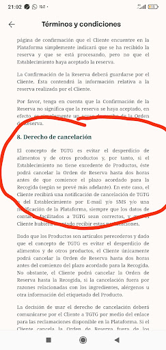 Read moreVergonzoso!! Me han cancelado un too Good to go en horario de recogida. La recogida era de 16:00 a 18:00 y lo han cancelado a las 16:41.ESO ES TENER POCA VERGÜENZA O NINGUNA!!! Llamó para pedir explicaciones y vaya formas de hablarme y además me dice que tenía que haber mirado el mvl.y yo me pregunto, para que? Si entre las 16:00 y las 18:00 puedo pasar cuando quiera. ESPECTACULAR!!! y además, en los términos y condiciones de too Good to go, pone bien claro que solo se podrá anular como muy tarde dos horas antes de la hora de inicio de la recogida. RESUMIENDO, LA CHICA QUE ME HA COGIDO EL TELÉFONO... UNA IMPRESENTABLE!!! Ahora que cada cual decida si quiere ir a un sitio...
