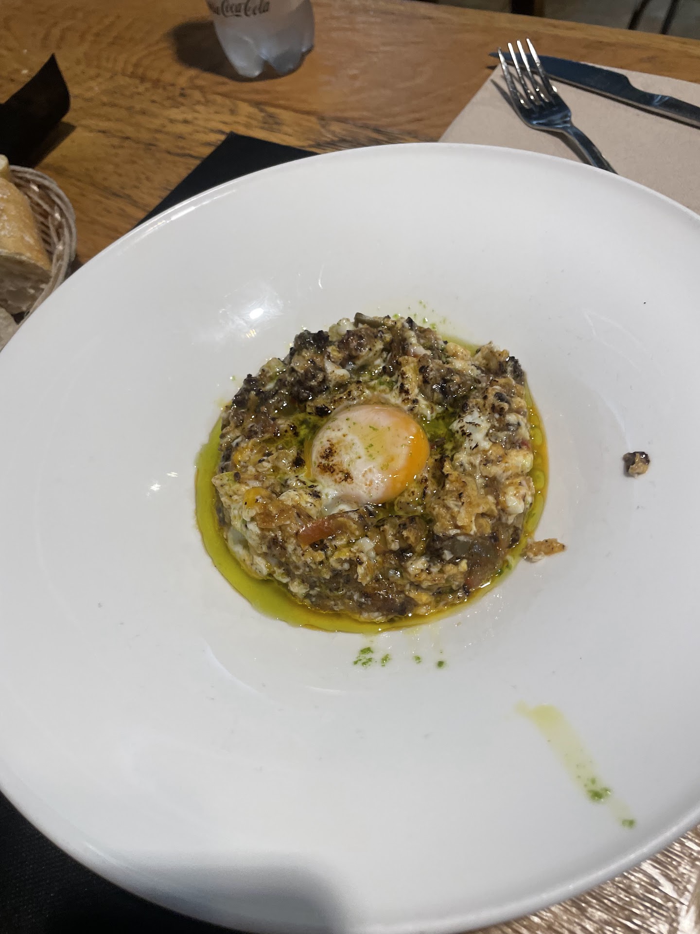 Buen servicio de camareras. Hoy día 20 de Julio, según menudo degustado. 1° Cogollos de tudela con anchoas etc, muy rico, de 2° merluza lomo de merluza a la plancha con refrito de vinagreta etc, INCOMIBLE, se le debió caer o abrir el bote de la SAL, lo devolví, me lo cambiaron por begiandi en su tinta...lo comi, pero mismo de lo mismo, a este cocinero o cocina, la sal....se les cae en abundancia, y dejo como reseña, soy de los que me gustan las comidas más bien Sabrosas ehh, para no poder comer la merluza y begiandi en su tinta, justo poder comer y por vergüenza no devolver otro plato de seguido....hay lo dejo. Y plato 3° confit de pato al oporto con manzana asada...esta bien el plato, PERO TE DEJA UN AMARGOR....eso si, la compota de manzana cojonuda,jeje. El postre...pedi espuma de mando con helado de chocolate, No puedo opinar, ya que para mi gusto no me gustó, NO digo estuviera malo, Para gustos pienso yo, todo ello con una botella de cava y un café solo y un Barcelona cola, precio 45,70e/ una persona. Espero valga para algo, como todas las reseñas que tengo en Google Maps y hasta ahora, voy batiendo récord. Gracias. No es dar mala fama, lo pongo para que cada uno antes de ir, sepa que se va encontrar y si esta reseña el dueño/a, cocinero/a, puedan corregir esos errores que según mi experiencia, No se pueden tolerar comidas SALADAS. Subo foto del Menu y algún plato del menú que hoy he cenado. TIPICO ERROR MUY COMUN AUNQUE NO LO CREAIS, COCINAR Y NO PRUEBAN LA COMIDA, SINO...vosotros serviriais una comida, plato que esta SALADO DE C...ES?, Yo jamás. Hay que probar lo que cocinas antes de servir a los clientes y cuesta el mismo género,tiempo de hacer MAL un plato, que hacerlo bien o a menos, No Servirlo si uno sea equivocado o está malo sin más. Foto del lomo de la merluza no saque, ya que de presentación muy buena como todos los platos pero se lo...