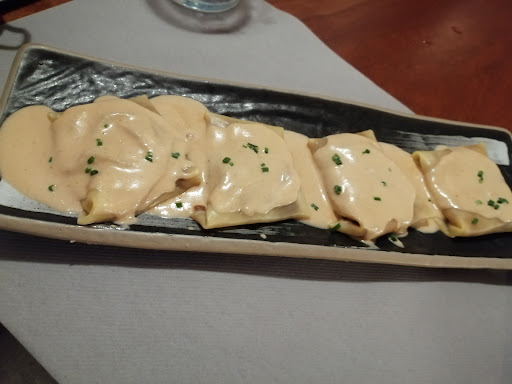 The food is exceptional. It’s genuinely hard to pick a favourite. The croquetas de gamba are a standout, intensely flavourful yet light and crisp. The raviolis de gamba are delicate and beautifully balanced, the pasta barely there. The calamari with caramelised onion was tender, full of depth, and perfectly seasoned. We also had mussels in a creamy sauce and a watermelon salad to start; fresh and summery without being obvious.