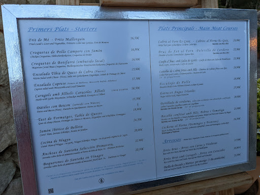 Read moreBeautiful setting at the end of a picturesque drive ( road from Inca to Lluc monastery), perfectly decorated interiors making it worth a one hour drive. We made a reservation online and there was euro20 reservation fee ( charged only if you don't show up or cancel with less than 6 hours notice). Truly beautiful setting, wonderful ambiance, excellent service. The food...... fresh but very blah, lacks spices or even salt. You have to ask for salt& peppers ( you get a surprised look and then salt &pepper shakers clearly coming from the kitchen - still in a supermarket plastic bottle , the pepper one was in pepper mill that was not working). Calamari were perfectly grilled but lacked salt or any spices and had this sleazy membrane inside that was not removed. Baked cod was fresh and baked, that's all I can say. Hot liver salad that was on an appetizer menu was good , the portion was huge, an equivalent of an entree rather than an appetizer . Can be a meal on its own. Perfect for sharing. Grilled artichokes, also from a starter menu, came beautifully presented and in a large portion ( 4 large pieces), perfect for sharing or can be a full meal for a vegetarian. Aside from a desert ( crumbled brownie in chocolate ice cream, served in a vine glass), the food was not memorable,) the setting and ambiance were. We came for food and it was a mistake. Come on a special occasion or bring the date, enjoy the whole setting and the service. Order wine, appetizer to share and individual deserts, and you will have a perfect time. To be fare, we have not tried any of the meat dishes, those from the grill may be good. Perhaps we will return to try those. It is a pricy place ( our dinner of two starters, two entrees, two coffee, one desert, one bottle of mineral water came to euro120). Many previos comments say that the place is overpriced for the quality of food. I agree that the food is not superb but the maintenance of the grounds, interiors, plenty of serving staff doesn't come for free. The whole experience is worth...