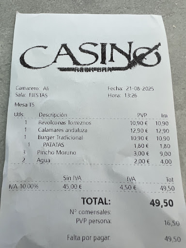 Definitivamente una decepción. No entiendo las reseñas buenas. Hemos ido mi cuñado, mi pareja y yo y nos ha dolido en el alma pagar casi 50€ por la calidad tan PÉSIMA de la comida y no es porque seamos tacaños, solemos ir a buenos restaurantes y no nos importa pagar la cantidad que sea siempre y cuando la calidad sea buena. Como se puede ver en el ticket nos hemos 1 plato principal, 3 para picar. La hamburguesa no esperábamos mucho, patatas ser sinceros, lo único que se puede rescatar un poco es la carne pero podría mejorar. También aparece PATATAS 1,80€ cuando nosotros no habíamos pedido la ración, por eso si, 10€ para una hamburguesa q no trae patatas, por lo menos la hamburguesa debería de estar buena. El camarero tampoco a preguntado que si queríamos añadir las patatas. Los calamares los peores que me he comido, estaba suuuuper chiclosos, estabas rebozados pero nada crocantes, les han pasado por encima y ya, de calamares no tenían nada. Los torreznos vienen con una “cama” como de una puré de patata con algún condimento que sinceramente nada de nuestro agrado, aparte nos ha salido un pelo en ellos. Si es verdad q los torreznos estaban crocantes. El pincho, de los peores, nos lo han traído fríos, estaban como crudos y duros. En fin, súper descontentos y definitivamente no volveríamos ni a tomarnos un agua y sobra decir q tampoco lo...