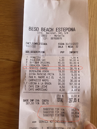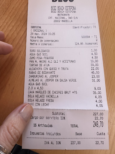 Read moreI would NEVER normally write a review like this. I would have preferred to write directly to the venue as negative reviews are hard to come back from. However in this case there is no email address on the website to contact except for their other venues. So unfortunately for Beso beach Estepona I have no choice but to rant here. This venue was such an obvious and offensive rip off that I had to write something. After eating a few starters to share we were not that hungry so our waiter suggested a small fish for 2 to share between three. This sounded like a good idea until Moby Dick was slapped on the table. At 1.7kgs who in their right mind would serve that for 2! It was a fish for 6 people. They never showed us the fish before hand and when we queried why it was so big they said 'it's all we had!'. At 100€ per KG it was offensive especially as the waiter took it back to the kitchen 3 times until it was actually cooked and no longer raw in the middle. But the final straw in knowing that they deliberately tried to rip us off was the way they had the cheek to suggest a recommended tip up to 18% and stated 'NO SERVICE CHARGE INCLUDED' whilst sneakily hiding a 36€ service charge in the middle of the bill that most people would normally miss. Yes they did offer us a free glass of cava to make up for the raw fish but after requesting the bill 4 times we didn't have time to enjoy it. It's a shame, beautiful setting and lovely decor but it's the deceitfulness at all stages that will ensure we never return. Also a message to the manager. Please do not serve paella and fish at the customers table in bare feet. It's not trendy or cool, it's simply off-putting. With these prices I'm sure you can afford a pair...