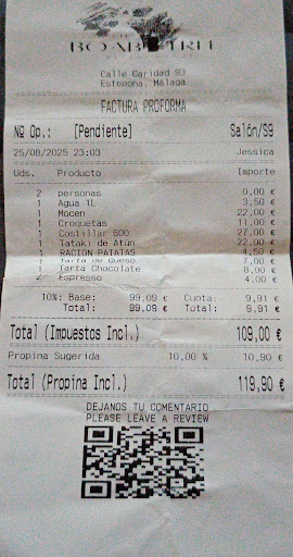At the time of the bill, a woman (who I assume was the manager or owner) presented a proforma invoice listing two totals: one without tip, which she explicitly said was the due amount, and one including a gratuity. Since she also asked if everything had gone well, I took the opportunity to point out the wine vintage discrepancy. She said it was a simple error, apologized for it, and added that the menu still needed to be updated. Yet deep down, it felt more like an excuse than anything else, possibly an attempt to add a few euros to the bill hoping we wouldn’t notice.