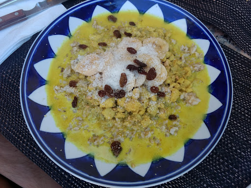 Se trata de un bar que no esperas encontrarte en un pueblo, un lugar con mucha paz y encanto. Cada elemento decorativo tiene personalidad, desde las mesas, las sillas... Los dueños un encanto y muy atentos y la comida espectacular. No sé trata de un bar convencional, no hay Menu pero hay platos muy contundentes y deliciosos. Se debería probar todo, el arroz con pollo al curry una delicia, la ensalada también buenísima, y el confit de pato increíble. Además de los...