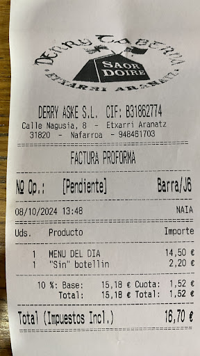 Had a great dinner here. Food was plentiful and tasted great. They only had a menu in Basque but waitress was very helpful and translated for us. We had a main course, 2 x glasses of wine and crème Catalan for pudding and total came to €27 euros so...