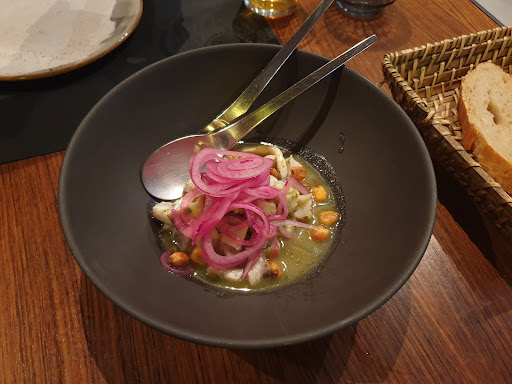 Read moreRestaurante correcto y con muy buen atendimiento por parte de la camareras, muy atentas. Ambiente muy acogedor y decoración de acordé. Aquí solo funciona con menus cerrados de 3 o 5 entrantes+segundo+postre. O 5 tapas más postre. Pedimos el de 5 ya que vimos que eran "pequeños", pero finalmente hubiéramos pedido el de 3. Ya que no fuimos capaces de terminar todo. Empezamos con el ceviche de Corvina, rico pero echo de menos un poco de picante y me gusta más cuando está hecho con lima y no limón. El segundo fue el taco de pico de pollo, bien, pero no había nada que destacará. Luego la croqueta de rabo de toro líquida. Muy bien elaborado, pero también me falto el sabor más contundente de la carne. Seguimos con el Foie, ese si... buenísimo, muy bien preparado a la vista y de "chuparse los dedos".. terminamos los entrantes con el huevo a la baja temperatura y morcilla de burgos. El aceite de oliva virgen extra que le da muy buen sabor al conjunto, quizás pondría menos puré. De segundo fue por un lado el Bonito con cous cous marinero y por otro la lasaña de carrillada de ternera... Ambos muy ricos, pero a esas alturas ya no pudimos terminar ninguno de los platos. Postres... mousse de chocolate 70% con Maldon y crema de lima...muy bueno y un dulce de crema catalana catala con frutos rojos que me pareció muy soso. En total fueron 66€ con 2 cervezas y 4 copas de vino. Un precio inmejorable para el conjunto. Además huyes de los típicos menús de playa que terminás un poco cansado si pasas más tiempo. Repetirémos seguro, pero la próxima vez pediremos seguramente el de las 5 tapas y el postre. Para aparcar tuve suerte en la primera calle sin salida a la derecha más adelante...
