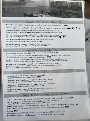 Read moreTisch telefonisch vorher avisiert (deutsch,englisch,spanisch seitens Restaurant ohne Probleme). Ein Tisch zu zweit gar kein Problem, sehr freundlich am Telefon. Der Hauswein ein Cuvèe (Sauvignon Blanc, Riesling und Chardonay) der auch empfohlen wird ist sowohl gut gekühlt als auch durchaus empfehlenswert. Beim Essen hatten wir ein paar unschöne Gerichte. Die Aioli ist so wie wie sie sein soll sehr lecker. Die Gambas al Ajillo waren leider nur lauwarm und in einem Fondähnlichen Sud sehr geschmacksneutral, kannte ich so noch nicht war auch nicht schmackhaft. Der gegrillte Pulpo war leider nicht sehr gut, lauwarm und fettig-tranig ( siehe Bilder). Spagetti mit Gambas recht wenig bis gar nicht gewürzt, Pfeffer und Salz werden auf Nachfrage jedoch gereicht. Nachspeise (Käsekuchen und Creme Catalan) war so lala. Zuckerkruste sollte frisch karamellisiert sein das geschah aber wohl weit vorher da sie eiskalt war und nicht mehr "krachig". Der Käsekuchen war für 9.00 Euro schon nicht mehr so lecker und hausgemacht. Insgesamt gute Lage am Hafen, freundlicher Service, das Essen für die Qualität leider viel viel zu teuer und mit sehr viel Potential nach oben. Weder die Tellerreste noch die Nachfragen zeigten wirkliches Interesse oder Mühe am Gast. Die Portionsgrössen sind für gute Esser eher zu klein. Der Gerechtigkeit halber sei die Paella mixta am Nachbartisch zumindest optisch sehr...