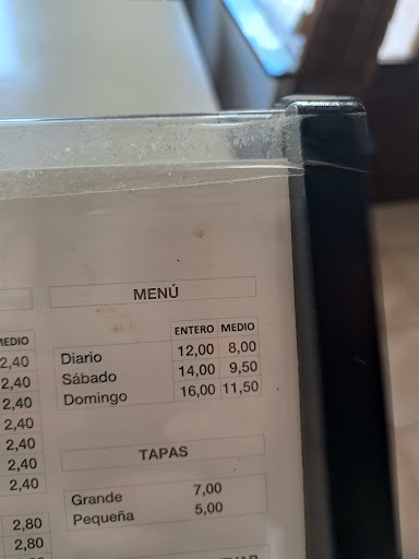 Read morePésimo, fuimos el domingo comimos el menú de 12,50€, paella de primero y pollo de segundo. El plato de paella era tirando a malo, pero el pollo al horno..., nunca pensé que se pudiera hacer realmente tan malo. El personal, he de decir que el chico bastante correcto,pero la chica que atiende me pareció no estar a la altura de un negocio. Su trato no fue amable para nada, cuando le pedí que me recomendara escoger entre los segundos me respondió que estaba muy ocupada para aconsejarme, me quedé a cuadros, pero el colofón fué cuando mi pareja acabó su primero, le retiró el plato mientras a mí me quedaba todavía medio plato para acabar y le trajo su segundo y el mío, dejando mi segundo en la mesa mientras acababa el primero, añadir que salimos del bar-cafeteria a las 14,30h. No tenían que remontar mesa porque tampoco había gente esperando para comer. Creo que no hace falta decir...