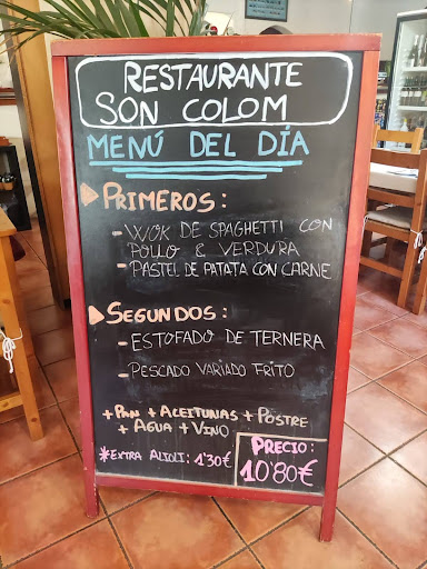 The Restaurante Son Colom was lovely, clean well presented and friendly. The host and his wife could not have been more welcoming. The meal was started with toasted bread, olives, raw garlic and tomatoes to rub onto the bread while we waited for our order to be cooked. We had between us steak, lamp chops, small whole chickens and chicken, ll cooked over an outside grill/BBQ, all perfectly coked and delicious. We could not have had a more wonderful time for a family meal Well...