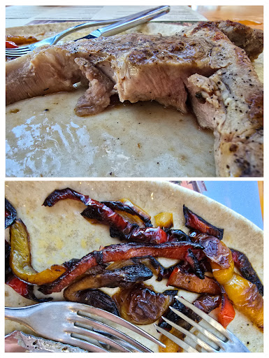 Beim Fisch wurden statt der Kartoffeln Pommes Frites serviert, kein Problem. Die Spaghetti Bolognese waren gut, Kind mochte sie. Aber beim Salat gab es Guacamole statt Avocado, Zwiebeln statt roter Zwiebeln, der Reis war leider ungenießbar, weil fast ungekocht. Der Teller wurde freundlich zurückgenommen. Zweiter Versuch: "Beef tagliata". Leider war das servierte Fleisch weder Rind, noch geschnitten, sondern offenbar ein sehr durchwachsenes Schweinekotelett. Der Koch sei sehr sicher, dass es sich um Rind handelte, die sehr helle Farbe und der Geschmack widersprachen ihm leider! Die Paprika-Beilage war leider größtenteils schwarz gebraten. Hier tauchten anstelle von Pommes allerdings leckere, rustikale Kartöffelchen auf.