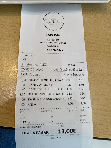Read moreSoy cliente desde que inició el funcionamiento del local. Hoy he tenido un incidente con la "empresaria" pelirroja que lo lleva por los paraguas que teníamos en la mesa. De acuerdo con que hay que ponerlos en el paragüero, pero si mi paraguas es caro, y lo roban, lo pagas tú? Pon un paragüero que plastifique. Es una verdadera barriobajera. Hay que tratar a los clientes con educación. De momento se lo puede permitir porque tiene mucha gente, pero los negocios van y vienen, y lo sé porque he estado cara al público muchísimos años. Con esa chulería y ésas formas, no se puede tener una cafetería. Sobran locales en Ferrol. Y conste que hay un camarero especialmente agradable, que creo que hoy no estuvo...