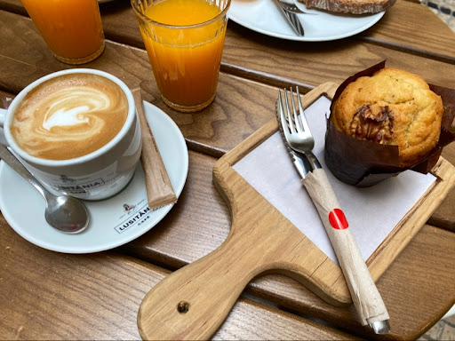 Quince minutos después el camarero trae el café y... Una rebanada de pan de molde, versión s.XXI, es decir pan de molde industrial "edición gourmet". -le indicó que le pedí expresamente pan artesanal de tahona - panadería. Coge el plato con la rebanada de pan de molde y sin darme opción de pedir otra cosa, se lo llevó y me he quedado sin desayunar. Moraleja: Los clientes no deben de pagar las consecuencias de estar de "mala Leite" por tener que trabajar el día de Navidad. Pensé en pedir la hoja de reclamaciones pero opté por lo siguiente: Ha sido la primera vez y la última que me ven en Lusitania Café.