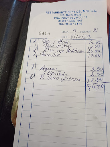 Read moreSvariate volte degli amici ci hanno suggerito di provare la cucina de la font de moli, e finalmente ne abbiamo avuto occasione; il personale è gentilissimo.e a diaposizione del cliente; hanno disinfettanti quasi in ogni angolo del locale. Il locale è molto pulito e accogliente. Purtroppo pioveva e non siamo potuti stare nella bellissima terrazza all'aperto ma comunque la veranda è molto intima e dà un senso di pace. Buoni gli entranti ma il pezzo forte è la paella. Provammo la paella di marisco (molto ricca di pesce, e soprattutto fresco) e la paella alicantina. Sia il coniglio che il maiale erano tenerissimi e cotti alla perfezione. È da circa un'anno che siamo clienti e la paella è sempre buonissima come la prima volta. I tempi di attesa sono "un poco lunghi" ma calcolando che la paella la preparano al momento è anche giusto così. Il pane con ali oli non manca e il pane è appena tostato così l'attesa per la paella sembrerà meno. Il prezzo é più che ragionevole calcolando la qualità e il servizio. Se passate da Finestrat dovete provare la loro paella che secondo me è la migliore di tutta la zona perchè non è la classica paella per turisti ma è la vera paella fatta...