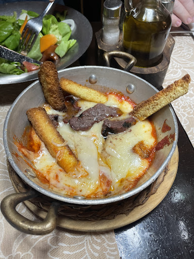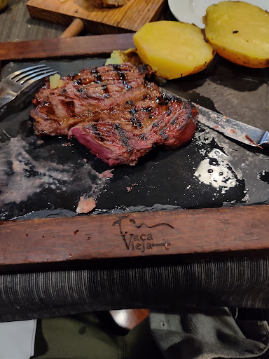 Pedí un chuletón de vaca madurado, en teoría son 700-800g, en la práctica no llegará a 600g (incluyendo el hueso) lo pedí MUY poco hecho y una parte del chuletón estaba quemada, y demasiado hecha por un lado, en el otro más o menos, me dio mucha pena ver qué una pieza de carne que costaba 47€ en carta pudiera ser tratada de una manera tan poco profesional por parte del cocinero que parecía más enfocado en sacar la comida lo más rápido posible para irse a su casa, no pude comerme el chuletón porque se quedó frío del sabor a quemado por uno de los lados y lo seco que había salido, literalmente del disgusto no quise seguir comiendo, ofrecieron hacerme otro segundo chuletón que me lleve a casa por la aberración, el que me lleve no es que estuviera muy rico tampoco, pero al menos fue un buen detalle, por eso no pongo una estrella y pongo dos, el trato del camarero fue bastante bueno y correcto.