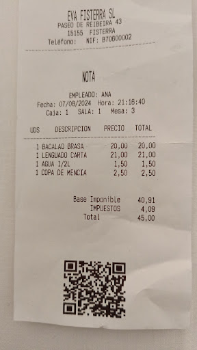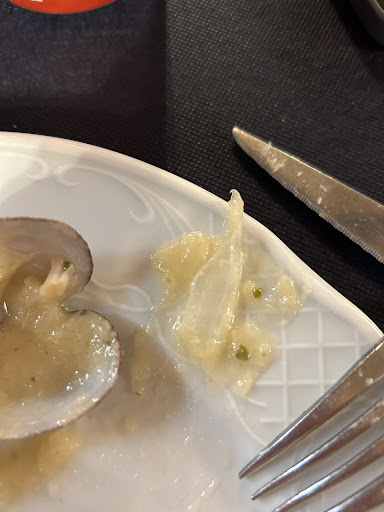 Read moreHace unos días, buscando reseñas de restaurantes en Fisterra dimos con este restaurante, ya que miramos la carta en la web y parecía interesante. Para nuestra sorpresa cuando nos dieron el menú, era completamente diferente a lo que habíamos visto en la web. Le pregunté a uno de los camareros y me dijo que era lo que había en la carta que la web la tenían que actualizar..No nos levantamos ya porque nos parecía una falta de respeto a los camareros que ya habían retirado los platos sobrantes de posibles comensales de la mesa, pero desde luego, debimos hacerlo. Pedimos cuatro raciones y según iban viniendo los platos iba empeorando la situación, zamburiñas absolutamente secas, calamares y croquetas sin más, pero el mayor de los problemas vino con las almejas, no sólo estaban resecas que parecía que nos estaban dando unas almejas recocinadas de sobras, si no que en mi caso, me encontré un trocito de plástico entre la salsa, yo dejé de comer almejas al instante. Uno de los camareros nos bromeó, al recoger los platos, que no podía ser que dejásemos dos almejas, que cogiéramos una cada uno, no supe cómo evitar eso sin tener que decirle el problema con el trozo de plástico, cosa que no dije porque realmente me incomoda más a mí decirlo que al restaurante servir comida en esas condiciones. Pedimos dos porciones de tarta de queso con la intención de quitarnos el mal sabor de boca, la tarta , pues una tarta cualquiera de queso, pero una vez más el sirope de fresa , claramente de bote con un sabor muy industrial mataba el postre. Añadido a esto uno de los camareros hablando a voces entre la cocina y el comedor, y usando un vocabulario que no te hace la cena muy agradable. No sé si fue una mala noche, no sé si los días previos que el tiempo fue tan malo que no se pudo mariscar y por tanto el producto no era tan fresco, o no sé si es que han cambiado de dueños y por eso la web no estaba actualizada y las reseñas que vimos no tenían nada que ver con el restaurante que nosotros visitamos, o no sé si sencillamente es la norma en este restaurante, pero por nuestra experiencia, no recomendaría este...