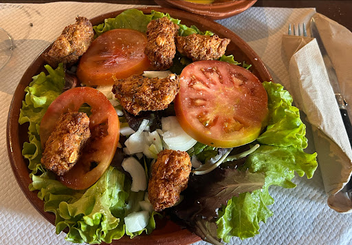 Al día siguiente (creo), después de haber terminado ya mi peregrinación fuimos ahí a tomar algo por la noche. Además, un amigo peregrino y yo también fuimos a recenar porque nos quedamos con hambre en el otro sitio. Esta vez escogí un “bocata de falafel con verduras salteadas”. Yo más bien lo llamaría “bocata de falafel con ensalada”, pero me da igual: El mejor falafel que recuerdo haber probado nunca, de verdad. Enhorabuena!