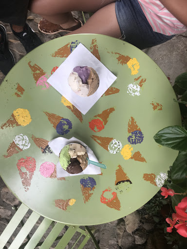 Because the other salty flavors sounded really adventurous (Roquefort, anchovies, vinegar,...) we decided to go for a second scoop called Perat-tellade, named after the village. This one was sweet and tasted very much like rose.